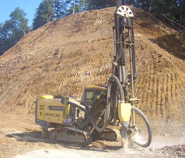 剥土された岩盤に穿孔機で複数の穴を開け、発破により岩盤を砕きます。